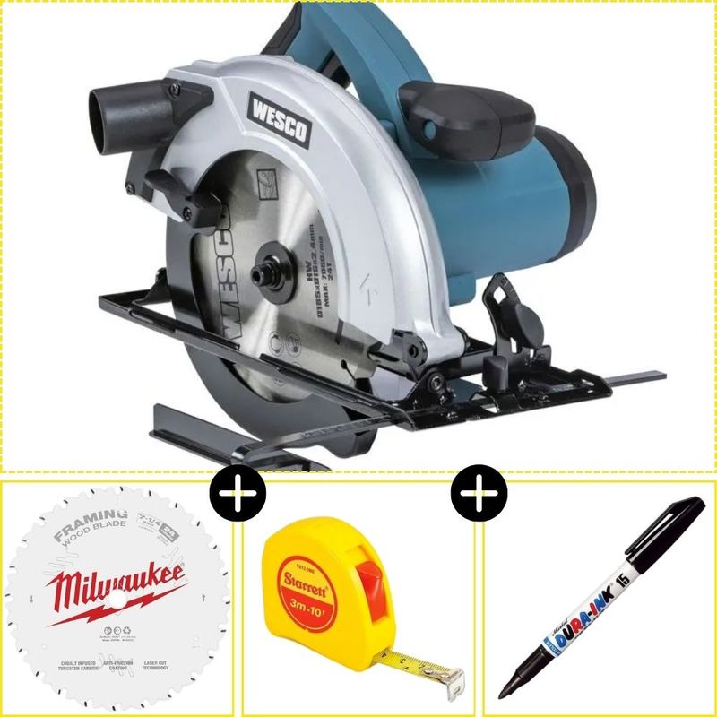 - Sierra Circular de 7” Wesco WS3441: Con un potente motor de 1500W y disco de 185 mm, esta sierra te permite realizar cortes exactos en diversos materiales. Su empuñadura ergonómica y botón de bloqueo garantizan un manejo cómodo y sencillo. La placa base de acero proporciona estabilidad, mientras que la salida de polvo mantiene tu área de trabajo limpio. Incluye guía paralela y hoja de sierra para madera. Con capacidad de bisel de 0° a 45°, velocidad de 5,500 rpm, profundidad de corte en 45° de 45 mm y en 90° de 65 mm, es ideal para cualquier proyecto de corte.