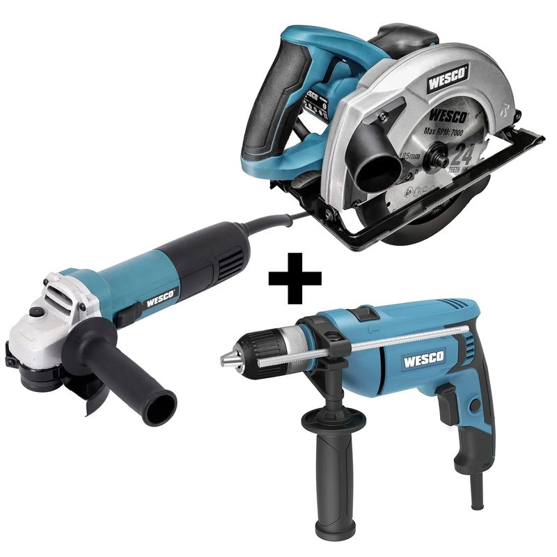 Este pack integra una sierra circular para cortes precisos en madera, un esmeril angular ideal para corte, desbaste y pulido, y un taladro percutor diseñado para perforar distintos materiales con potencia y control.