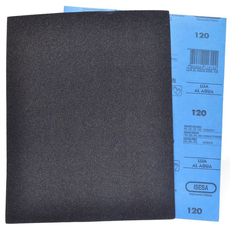 Lija al agua aplicación en húmedo, pre-pintado, terminación de línea metalúrgica y automotriz (pinturas y masillas). Para un lijado de primera en metales, masillas y pintura automotriz, motos, camiones, lanchas, etc. Nuestros pliegos de lija al agua azul pueden ser utilizados a mano, sobre bloques de goma o en tacos lijadores. El respaldo de papel de esta lija, es tratado especialmente para tener una completa resistencia al agua, lo que le otorga impermeabilidad y una tolerancia a la deformación en su uso en húmedo.