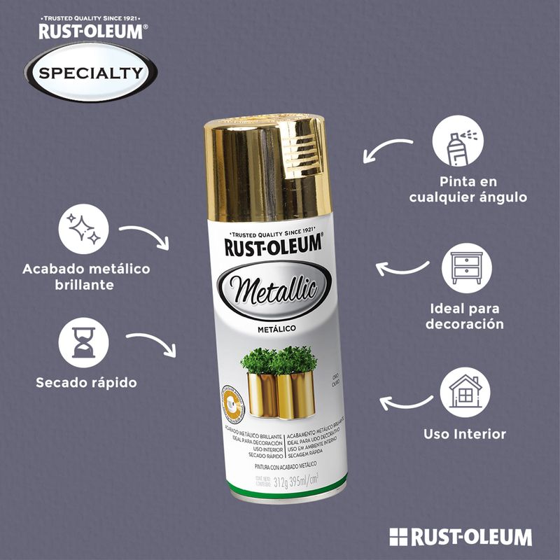 Los Aerosoles metálicos de Rust-Oleum® ofrecen un acabado intenso y brillante que se puede aplicar en madera, metal y más. Esta pintura proporciona un aspecto metálico brillante ideal para marcos de fotografías, candeleros, manualidades de días festivos y más. Diseñada únicamente para artículos decorativos de interior.