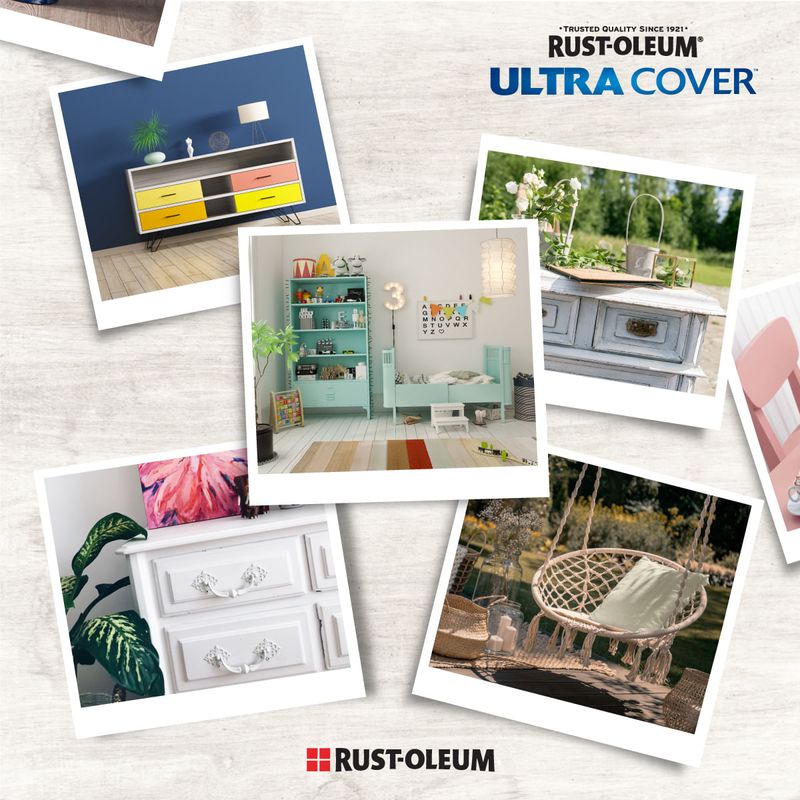 Renueva, restaura o recicla tus objetos con la Pintura en Spray Rust-Oleum® Ultra Cover® 2X. Su fórmula ultra cubritiva permite aplicar directamente sobre madera, metal, plástico, mimbre, vidrio y melamina, logrando un acabado brillante y duradero. Con tecnología de 360°, puedes pintar en cualquier ángulo y disfrutar de un secado rápido.
