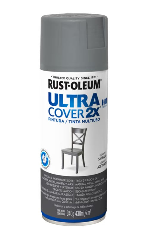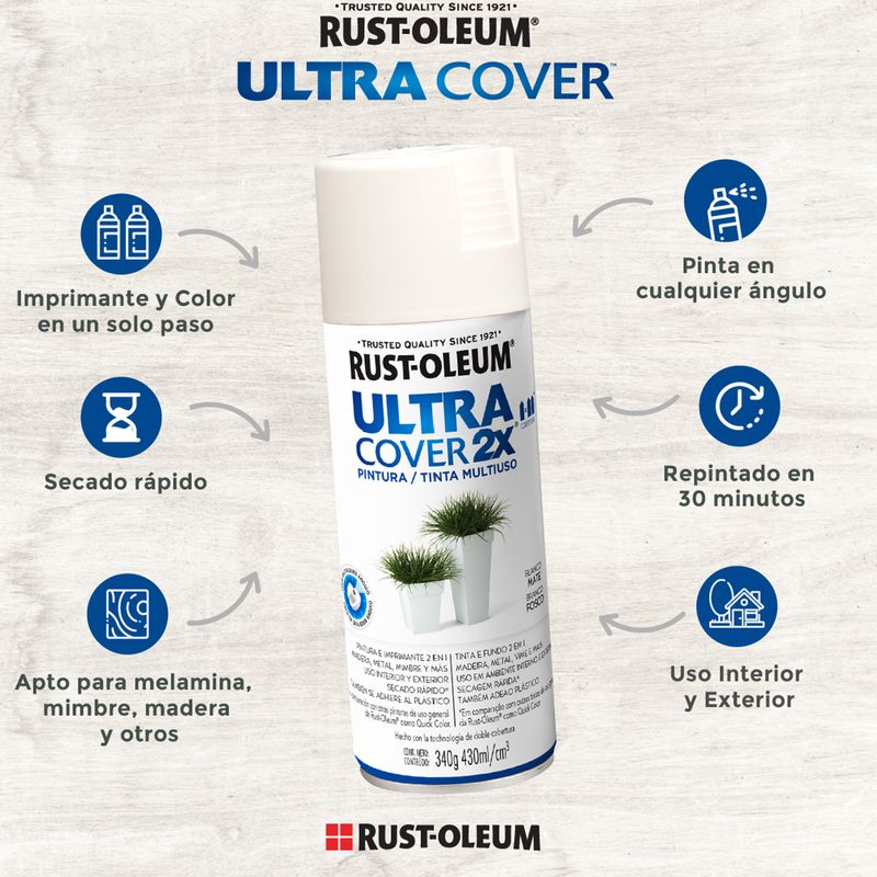 Renueva y protege tus objetos con la Pintura en Spray Rust-Oleum® Ultra Cover® 2X. Su fórmula ultra cubritiva permite aplicar directamente sobre madera, metal, plástico, mimbre, vidrio y melamina, logrando un acabado satinado y duradero. Con tecnología de 360°, puedes pintar en cualquier ángulo y disfrutar de un secado rápido.