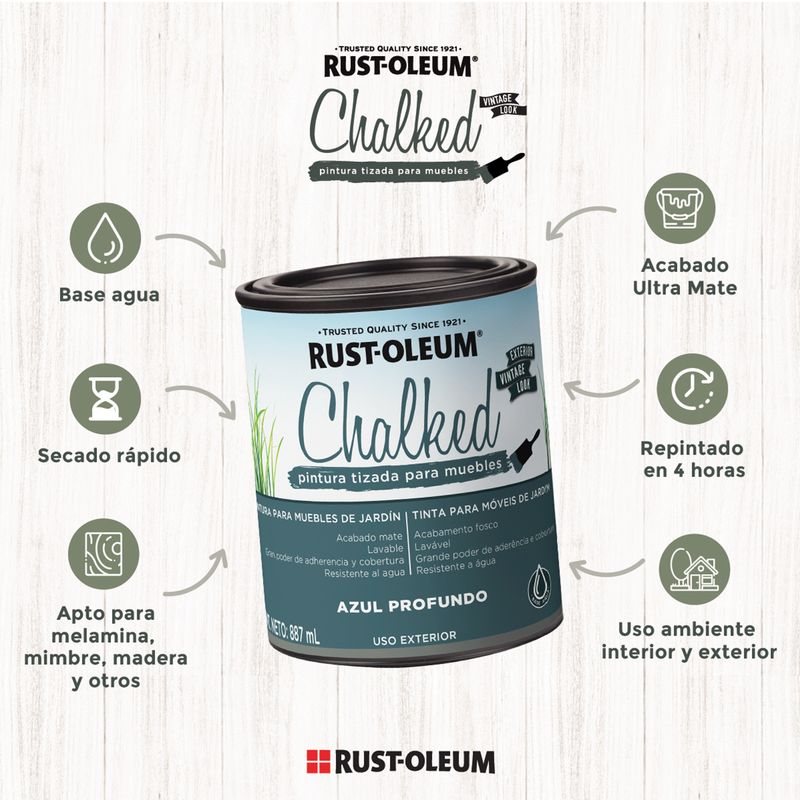 Pintura tizada base agua de acabado ultra mate, con excelente adherencia y cobertura. Ofrece un acabado moderno, duradero y lavable, resistente al agua, intemperie, agrietamiento y descascaramiento. Ideal para transformar y renovar muebles y objetos de interior y exterior.
